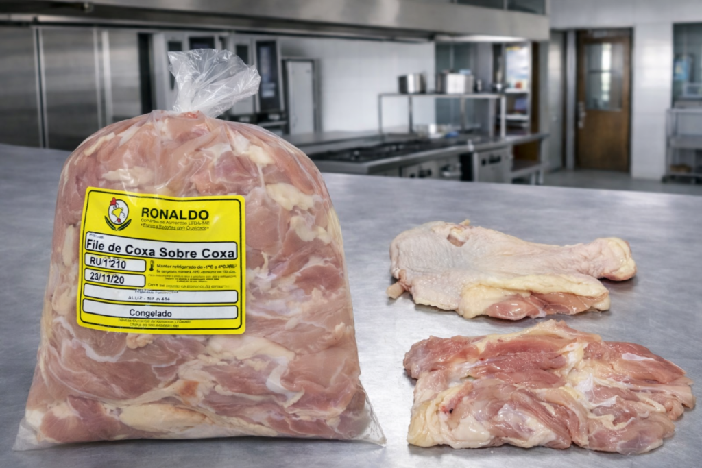 Coxa e sobrecoxa desossadas com pele, ideais para receitas que exigem mais sabor, suculência e padronização no preparo.